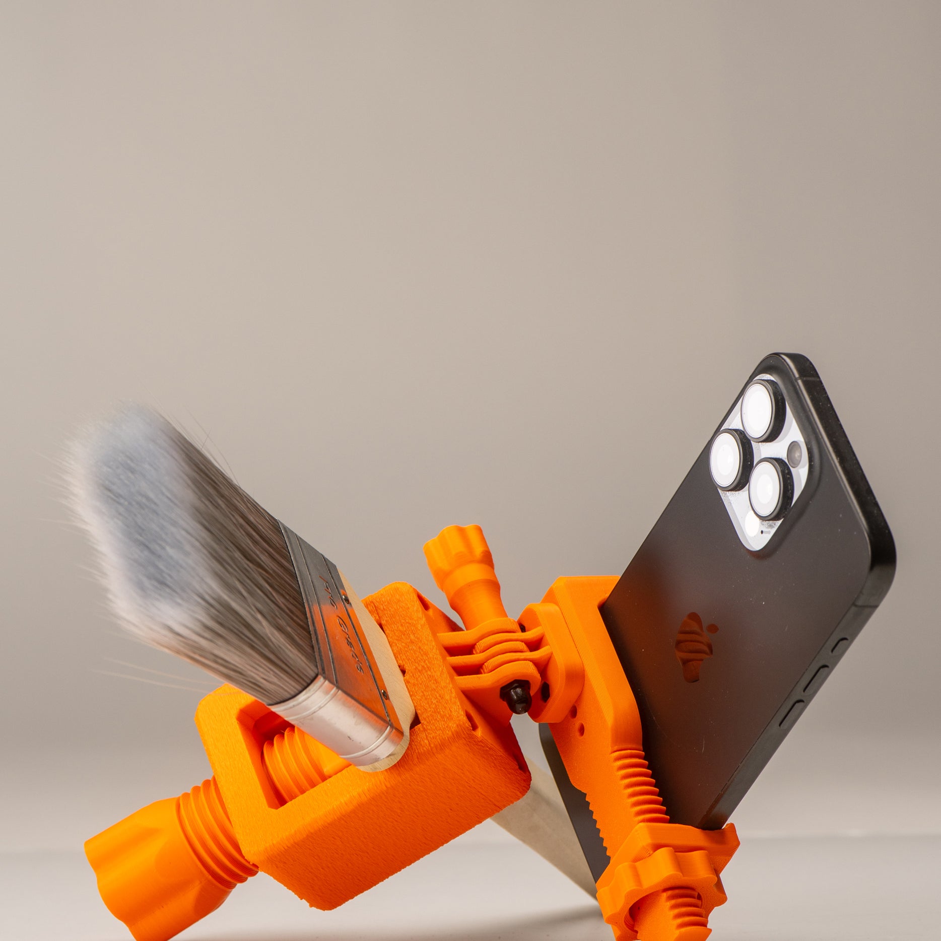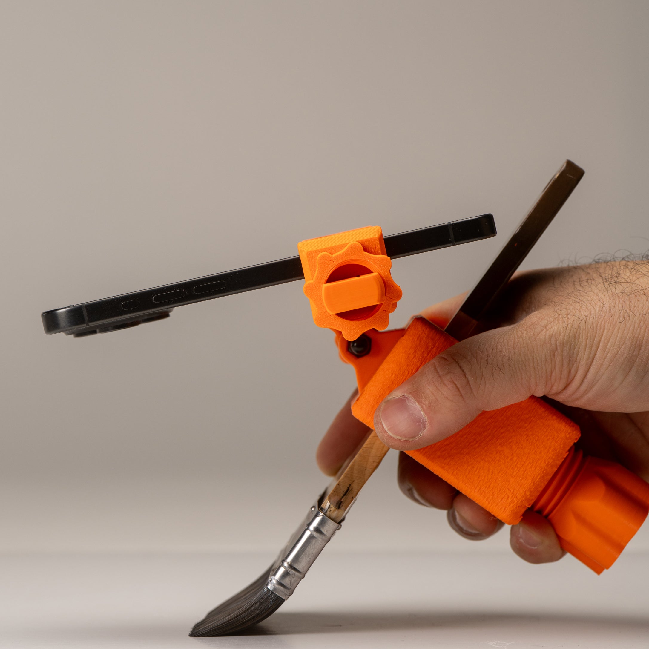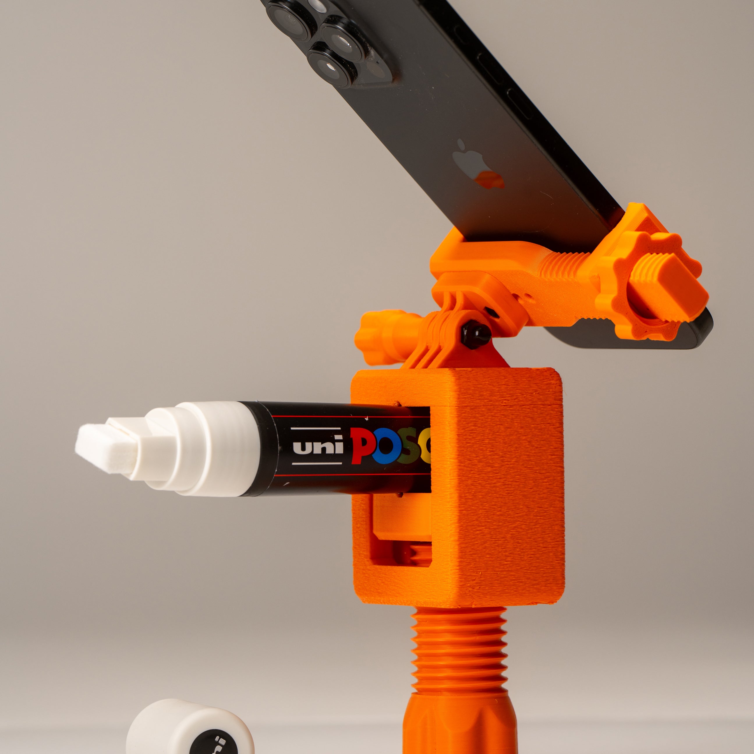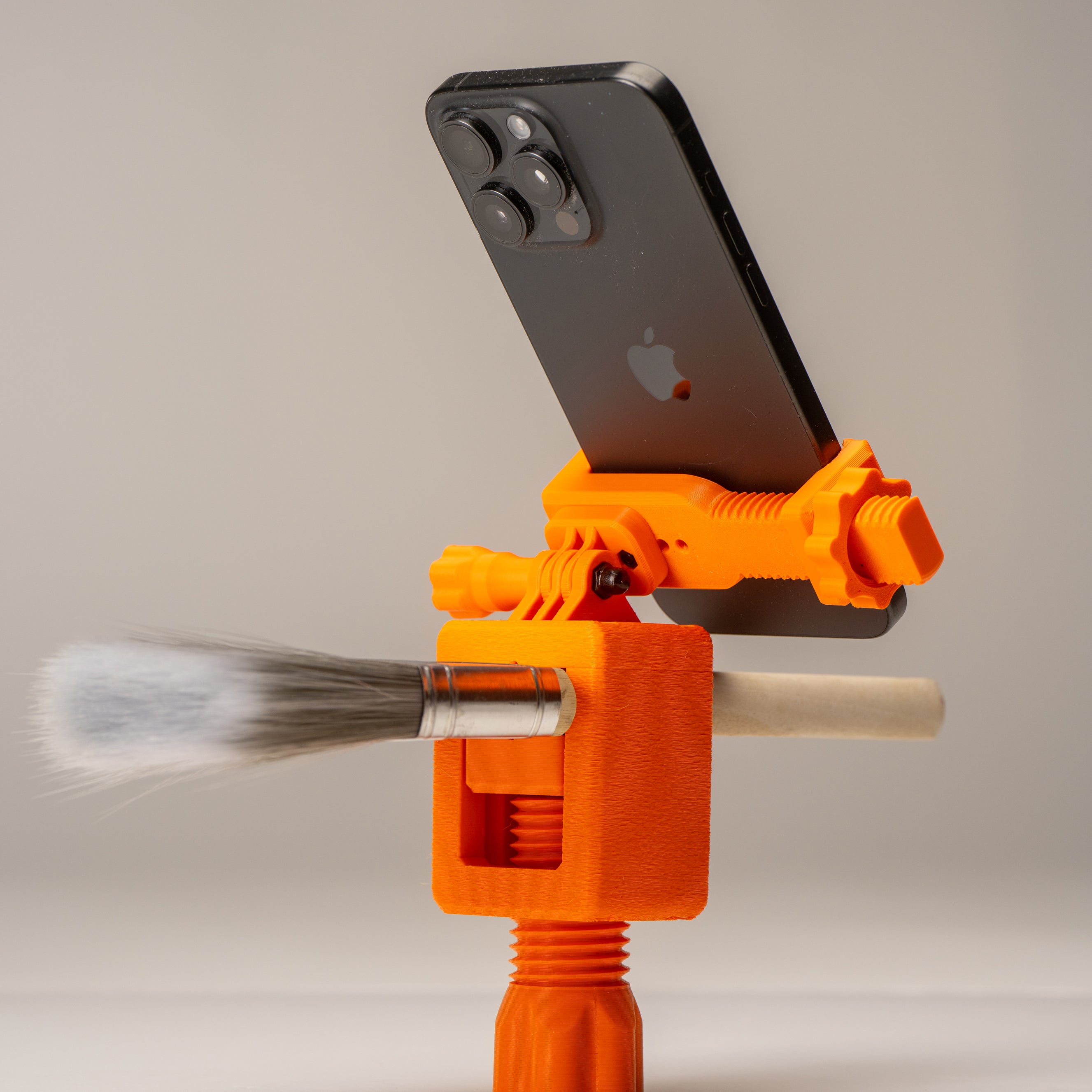 A secure clamp system holds a wide range of brush handles and large markers, while an adjustable pivoting arm lets you dial in the perfect camera angle. Your phone slips into its own clamp and tightens down firmly, keeping the shot stable while you focus on making the work.